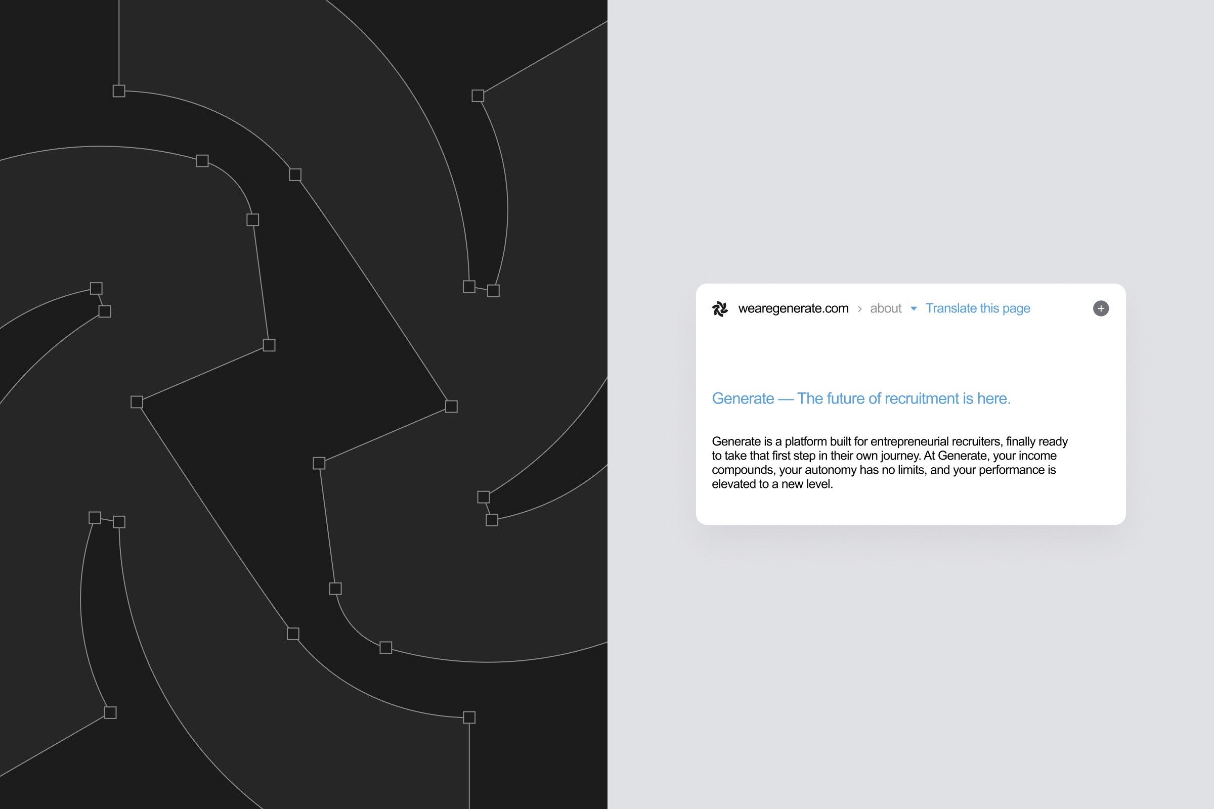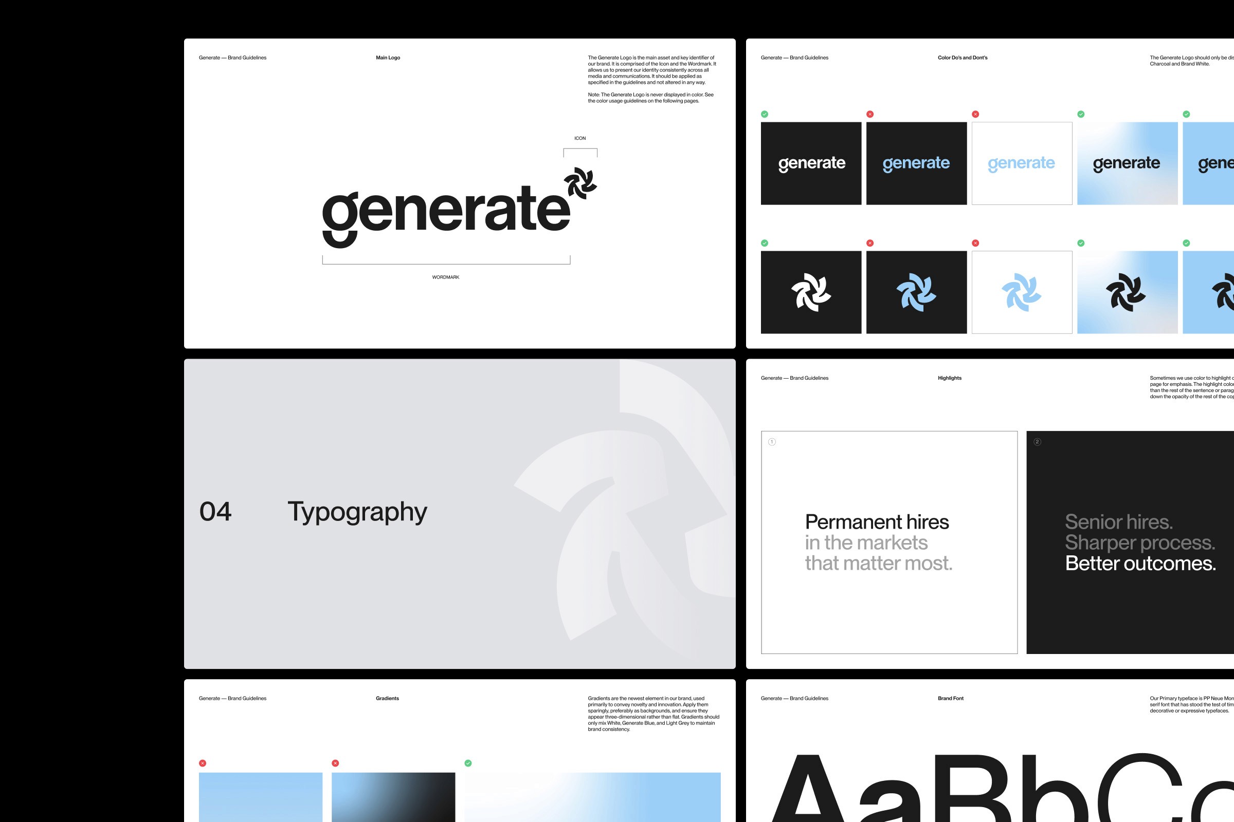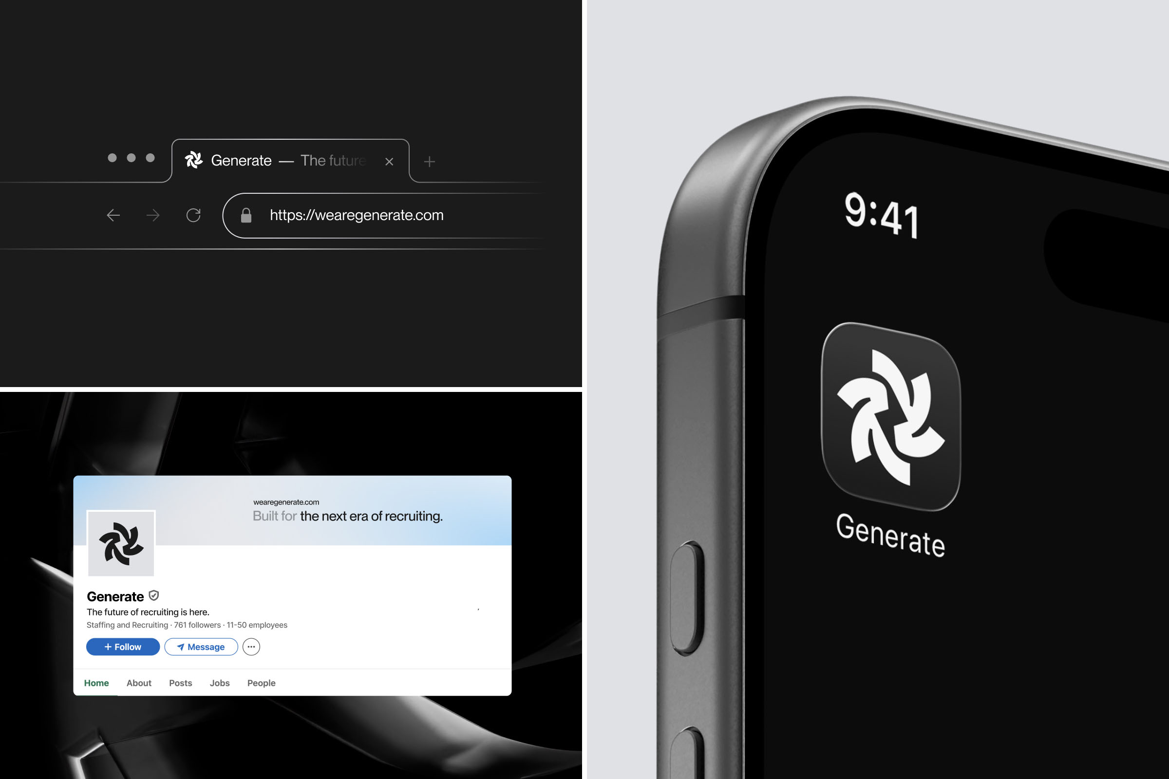 Generate is an AI-powered recruiting platform created for entrepreneurial recruiters to build referral-based teams, track broker performance, and earn recurring income within a community-driven model. In a crowded recruiting and staffing space, Generate needed a brand that stood apart from generic platforms, balancing technological sophistication and financial credibility with a human, community-first feel.